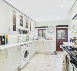 At the end of the hallway is the kitchen, fitted with modern wall and base units, complementary worktops and upstands, and a 1½ Franke sink. Integrated appliances include a fridge/freezer, AGA, Neff microwave and wine cooler. A charming stable door with a feature beam above opens directly into the garden. The hallway also benefits from a useful understairs cupboard, ideal for coats and shoes.