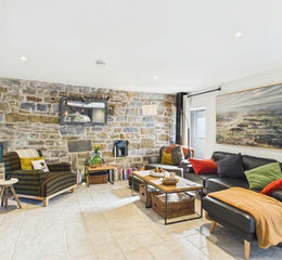 There is ample space for a dining table, with patio doors opening out onto the garden, perfect for entertaining and enjoying the far-reaching views. Opposite the kitchen, the living area provides a cosy yet generous space, featuring an exposed stone wall and plenty of room for furniture to suit.
