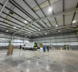 The unit is built on a steel portal frame with insulated profile sheet cladding to the upper walls and roof. The pitched, hipped roof includes translucent panels providing excellent natural light, and a section is fitted with solar panels.