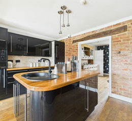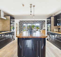 The main entrance features a cloakroom and stairs to the first floor. The dining room leads to a fitted kitchen with central island and integrated appliances, opening onto a bright breakfast area with stunning views over the gardens. A large utility/boot room provides practical functionality, while a 30’ sitting room with dual-aspect windows creates a spacious and welcoming living area. The ground floor guest suite includes a shower room, whilst there is an additional cloakroom.