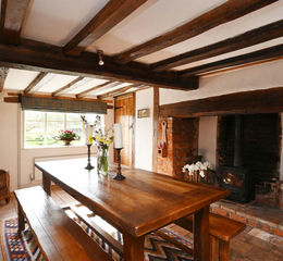 A door to the front of house leads to the hallway with coat pegs and one of three staircases leading to the first floor. Off this is the dining room that has exposed timbers, an inglenook fireplace with wood burning  stove and pamment tile flooring. From here, there is access to the utility room, inner lobby, a set of stairs to the first floor and a door to the snug. The snug has a window overlooking the drive and a built in bookshelf/television recess. From here there is access to a study. This has exposed timbers and a window. The inner lobby has the third staircase to the first floor with an understairs cupboard which houses the oil fired boiler. There is a door to the kitchen/breakfast room, utility and also to the sitting room.