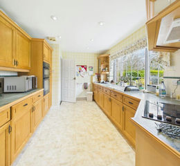 A spacious kitchen with wall, base and drawer units and superb views over the rear garden. Work surface over, tiled splash back, 1 1/2 bowl sink and mixer tap, space for fridge, electric double oven, hob and extractor, ceiling spotlighting and radiator.