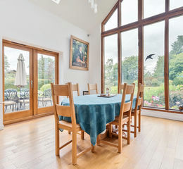 The fitted kitchen opens directly to an impressive vaulted double aspect dining room with French doors out to the paved terrace and surrounding garden, and there is a striking full height oak framed window, again with lovely views out to the garden.