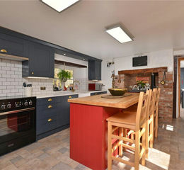 Kitchen/Breakfast Room - A delightful dual aspect room overlooking the garden. Exposed lintels. Kitchen comprising a range of matching wall and base units, with Belfast sink set into quartz work surfaces and a range of integrated appliances including dishwasher, fridge and a range style cooker with extractor over. Oil fired Rayburn set in a chimney recess.