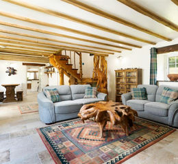 The barn conversion, equally impressive, offers versatile accommodation with a warm and rustic atmosphere. On the ground floor, there's a flexible space currently used as a dog grooming room – easily transformed into a third bedroom or office – along with a unique cloakroom featuring a sink made from a copper jam pan. The bespoke kitchen includes oak countertops, a breakfast bar fashioned from an antique cartwheel, and full utility connections. The spacious living room boasts a vaulted ceiling, French doors, a log burner, and underfloor heating. Internal access leads to an insulated garage and workshop with power and lighting.