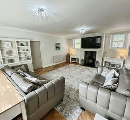 Ceiling light point, coving to the ceiling, dual aspect double glazed windows with plantation blinds to the rear, radiator, multi fuel wood burning stove, Karndean flooring, double doors leading into the kitchen.