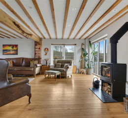 Double doors lead through to a characterful lounge featuring exposed beams, oak flooring and a log-burning stove, creating a warm and inviting retreat with large windows showcasing the views.