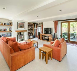 From the kitchen there is access to a useful utility room, a shower room, and a quirky triangular larder store. The sitting room is a generously proportioned living space featuring twin external doors opening to the rear garden and a wood burning stove with ornate stone hearth.