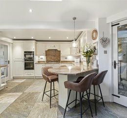 Dining/Kitchen - 5.31m x 3.84m (average measurements) (17'5" x 12'7 - With shaker style units including base cupboards and drawers, wall cupboards and granite worktops, breakfast bar, enamel sink unit, five ring gas hob with extractor hood, double oven/grill, tiled floor, contemporary radiator, dishwasher, side porch with access to: