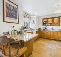 The kitchen has a country style, fitted with granite worktops, integrated washing machine and dishwasher, and centred around an original inglenook fireplace with bread oven—an authentic feature that reflects the age of the building. A separate dining room includes a pressure jet Rayburn, which also heats the radiators throughout the house, adding both function and character.