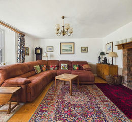 The main sitting room is comfortable and well proportioned, with a multi-fuel woodburning stove, while a third reception room—complete with original meat hooks—offers a flexible space that could suit a home office, studio or playroom.