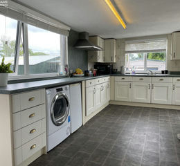 Matching range of base and eye level units with worktop space over, 1+1/2 bowl stainless steel sink unit with single drainer and mixer tap, space for fridge/freezer, fitted electric oven with built-in hob, uPVC double glazed window to side, uPVC double glazed window to front, door to Storage cupboard with shelving, doors to: