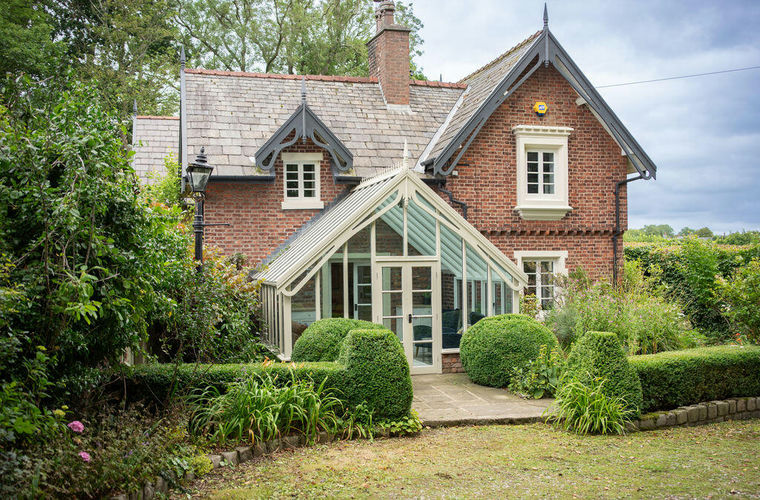The beautifully curated frontage is framed by established hedging and richly planted flower beds, bordering a charming patio that extends into a pathway, leading to the formal entrance at the front of the property. Continuing over this patio guides into the home through a Victorian-style orangery.