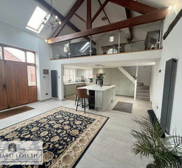 Tucked away at the top of a private lane, The Stables enjoys an enviable position with views across Avro Golf Course. Approached via a cobbled lane to its own driveway, the property immediately sets the tone with ample parking and a sense of peaceful seclusion within a charming, small barn conversion complex. Step inside and you are welcomed into the breathtaking open-plan breakfast kitchen, beautifully designed with sage green cabinetry, crisp white Quartz worktops, traditional Belfast sink, wine fridge and full range of integrated appliances. This impressive space is enhanced by a striking mezzanine level above, creating a versatile sitting or study area which overlooks the kitchen, perfect for both relaxing and working from home. From the kitchen, a hallway leads through to a separate sitting/dining room, along with a conveniently located washroom/wc. A short staircase then descends to the lower ground floor, where bedroom one offers a peaceful retreat with views over the courtyard, complemented by a stylish shower room featuring a sleek walk-in enclosure. Bedroom five is also found on this level, offering flexibility for guests, family or home office use. To the rear lies the main lounge, an impressive space measuring 18' 5" x 15' 7", with patio doors leading directly onto the courtyard.