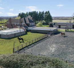 The equestrian facilities are particularly noteworthy, centred around a floodlit arena allowing for year-round schooling in complete privacy. The stable yard is well arranged, comprising six loose boxes, barns, and a dedicated tack room, ensuring practicality and ease of use. The pastureland is thoughtfully divided into multiple paddocks, ideal for rotational grazing and flexible management. All fields are enclosed by post-and-rail fencing and benefit from a direct water supply, making the setup both efficient and highly functional.