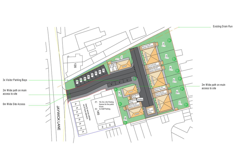 The scheme permits the squash courts to the rear of the pub to be demolished and the development of 6x 3 bedroom semi-detached houses and 3x 3 bedroom detached houses with 2 parking spaces each.