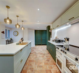 The impressive breakfast kitchen is a chef's dream, featuring high-end appliances including a fridge/freezer, dishwasher, and a 'Stoves' range cooker with an induction hob. With ample preparation space adorned with elegant Quartz work surfaces, a dual aspect double sink, and a convenient breakfast bar, this kitchen is designed for both functionality and style. A dedicated laundry cupboard adds practicality, while the seamless transition into the garden room/orangery offers a perfect setting for informal dining, complemented by a further sitting room with dual aspect windows and a living flame fire.