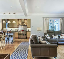 Built in 1966 Owlswood has white painted brick elevations under a tiled roof. Entrance is into a spacious hallway with coats cupboard and then oak glazed doors lead through into the living dining room which enjoys triple aspect with large windows allowing for masses of natural light, a theme which runs throughout the property. There is solid wood flooring and French doors leading onto the terrace. The room flows into the fully fitted kitchen at the end.