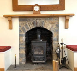 The main residence is arranged around a light and welcoming entrance hall, from which a generous 21ft x 21ft sitting room is accessed. This impressive space features bespoke shelving and a character fireplace housing a wood-burning stove, creating a natural focal point. Glazed double doors lead through to a spacious conservatory, perfectly positioned to enjoy views over the gardens throughout the seasons.