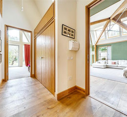 Designed with both flexibility and flow in mind, the layout is entirely step-free and wheelchair accessible. A dramatic double-height central living space forms the heart of the house - flooded with natural light from floor-to-ceiling glazing and clerestory windows and, effortlessly connecting cooking, dining and relaxation areas beneath timber-framed pitched ceilings. Four generous double bedrooms line the northern wing, complemented by two wet rooms, while a separate office or gym provides easy potential for a fifth bedroom.