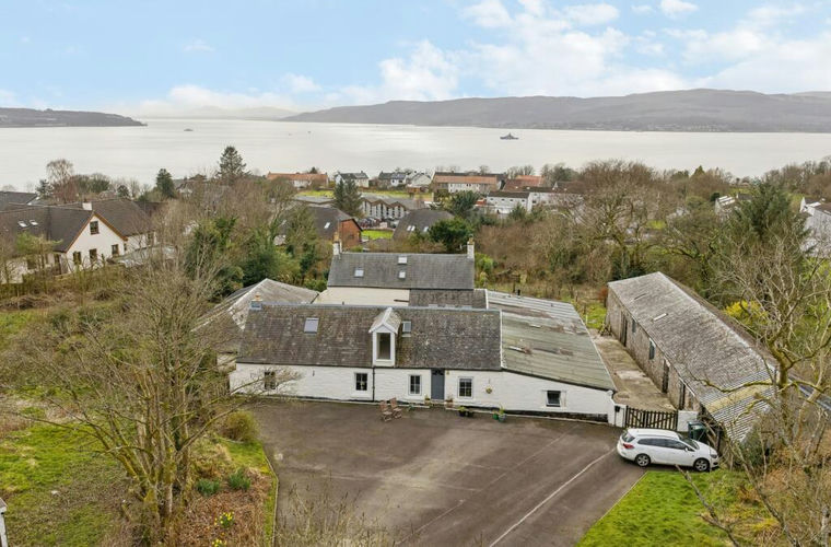 Externally, the grounds are a defining feature of Meikle Aiden Farm. Extending to around an acre, they encompass a range of traditional barns and outbuildings, offering significant development potential. The elevated setting affords sweeping views over the surrounding village and across the Clyde Estuary, creating a serene and scenic backdrop.