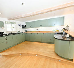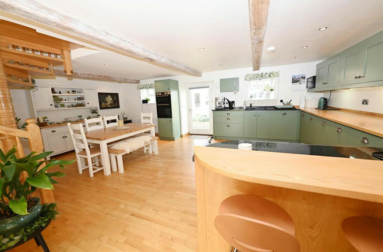 Kitchen, Living & Dining Room - 7.07m x 5.04m (23'2" x 16'6") - A great space with Oak flooring & a ‘contour-raised’ KITCHEN AREA fitted wall & floor units, Beech & Granite worktops, breakfast bar, integrated ceramic hob, eye-level oven, fridge, freezer & dishwasher. Large DINING AREA. Beamed ceiling with down-lighting. 2 double-glazed windows & door to rear. Store (1.32m x 1.00m/4'3" x 3'3") & American Ash spiral staircase to: