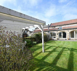 Enclosed South-East Garden - Stone boundary walls, full-width flagged patio, lawn with flower/shrub borders, pergola, light, power & cold-water tap
