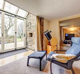 Rear Entrance Porch - Machined wood flooring, exposed beam and stone walls, feature roof window to first floor, double glazed bifold doors to patio.