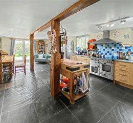 Front door into the Entrance Hall with two storage cupboards and stairs rising to the first floor. An opening leads into the Garden Room a great reception space with dual aspect providing the ideal space for casual seating. A door leads into the Office/Library a superb reception space, used by the current Vendors as a home office/Library with full-height bookshelves, fireplace with wood burning stove and with views across the side gardens. The Inner Hall provides an additional storage cupboard and with a door into the spacious dual aspect Sitting Room creating a superb reception space. The Rear Hallway connects the original main house to the modern converted wing of the property, with an external door leading to the garage parking area and a door into the Cloakroom with close coupled WC and wash basin. The spacious Utility Room hosts the solar panel inverter along with batteries, the pressurised water cistern and related pipework as well as providing space and plumbing for a washing machine and tumble drier and with a door leading to the gardens. Accessed via the Rear Hall, a door leads into the Kitchen/Dining Room, the real ‘heart of the home’ with a 28ft x 18ft space catering for a large dining area space along with additional casual seating with double doors opening onto the patio. The Kitchen is fitted with an extensive range of matching units with work surface over incorporating sink unit. There is space for a Range cooker, space for a fridge/freezer and space and plumbing for a dishwasher. A further door provides internal access to the large double garage.
