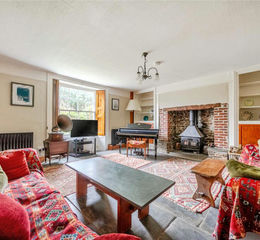 One of the main rooms of the property is the impressive drawing room rich in period charm and well suited to both relaxed family living and entertaining. A striking inglenook fireplace with a traditional wood burning stove forms the natural focal point of the room, framed by exposed brickwork and stone detailing which reflect the heritage of the property. Generous proportions allow for a variety of seating arrangements, while a large sash window draws in excellent natural light and provides an attractive outlook over the surrounding grounds. Built in shelving and cabinetry add both practicality and display space, complementing the room’s warm and inviting atmosphere. With its original features, flagstone flooring and comfortable scale, the room offers a wonderful blend of character, comfort and timeless country appeal.
