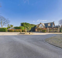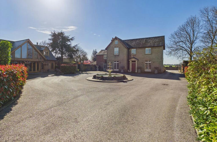Spreading across the front of this village road, mature Laurel trees shield the property from the road with the addition of iron railings. The sweeping driveway is accessed via electric gates and twin pillars and ravels down past further hedging opening to the spectacular front driveway which circles the impressive fountain. The grounds total approximately 2 acres in size and these provide various sections of outside space. The traditional gardens are positioned more toward the front and this sizeable space provide manicured lawns and grounds all screened with mature shrubbery to the sides along with mature trees. To the opposing side of the driveway, there is a further enclosed space housing a glass house with plenty of area around to create a kitchen garden. A large pond has been created, and this expansive feature enjoys further fountains within as well as having seating space and pathways surrounding. The external studios overlook a further area of garden, and a patio continues ...