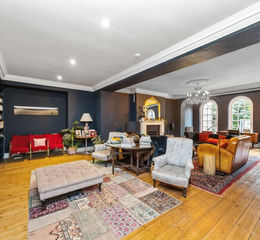 Sitting centrally to the house, the reception hall links the main rooms on the ground floor via double doors. This space feels like a room in its own right, with gleaming wood floors running over the threshold to the drawing room, but also with access to the side entrance and a useful ground floor cloakroom (complete with in ceiling speakers). A door also opens to the bottom of the spiral staircase, originally for servants, but now enjoyed by the younger family members as a fast route up to their rooms. As the largest room in the house, the drawing room is elegant and incredibly spacious with over 50 sq. m. to be enjoyed. Three full height arched French doors open to the garden and pool which becomes a summer extension of the home, while in winter, the whole family can cosy up on sumptuous furnishings by the open fire. It is room which invites entertaining after dinner parties held in the dining room adjoining. A bookcase reveals a door to the cellar where wine can be easily accessed for such occasions.