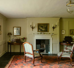 On the south side of the house is a pretty sitting room with a large, open hearth, most likely in what was the original 18th-century kitchen. The room is airy and light with views of the stunningly planted front garden from one side and distant hills in the other. Wide oak floorboards run underfoot and lime plaster, as with much of the ground floor, is washed in neutral, creamy tones.