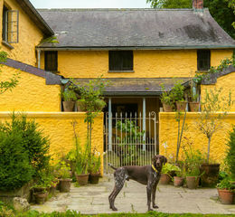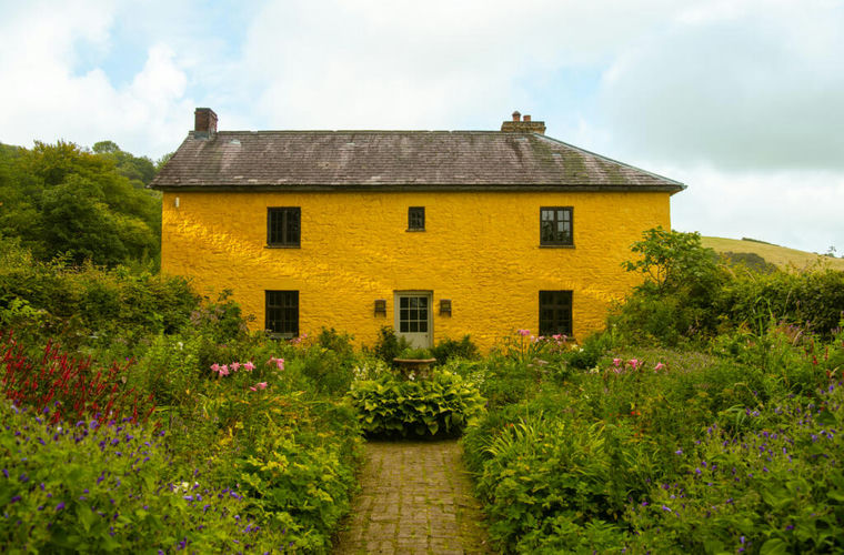 The approach to the house is via a country lane lined with oaks, along an ancient farm track that rises gently into the surrounding hills. Framed by age-old woodland, the striking yellow ochre limewash façade comes into view. The house and barns are nestled on the lower rises of the Mynydd Figyn, one of the many hills that make up the lower Cambrian range which forms the backbone of much of West Wales.