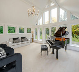 Approached via a gated driveway, Quoin enjoys a sense of peace, privacy, and seclusion that few properties can match. The grounds wrap gracefully around the house, visible from most rooms and creating a constant connection to nature throughout the home.