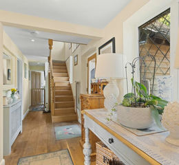 The gardens wrap themselves around the property and extend to approximately 1.50 acres, principally laid to lawn and approached over a raised stone seating terrace. There is also a children's play area, chicken run and timber shed to one side. The sweeping lawns lead down to an orchard, pond and steps to a 'dell' - a lower section of garden and woodland.