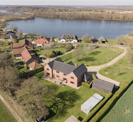An exceptional modern design Manor (2015/16) set on an elevated 1.4-acre plot with panoamic views over South Walsham Broad and countryside. Featuring spacious, light-filled interiors, luxury bedroom suites, a high-spec kitchen, underfloor heating, triple garage, and beautifully landscaped gardens—perfect for private, contemporary family living and entertaining.