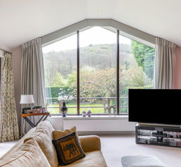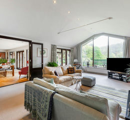 The bedrooms are all of generous proportions. The main bedroom has a vaulted ceiling and two sets of French doors out to the deck overlooking the garden and views beyond. It is adjacent to a further spacious bedroom, a fitted dressing room, and a bath and shower room. There are three further bedrooms, two with ensuite bath and shower rooms, and a family bathroom. The kitchen, and all the bathrooms have underfloor heating.