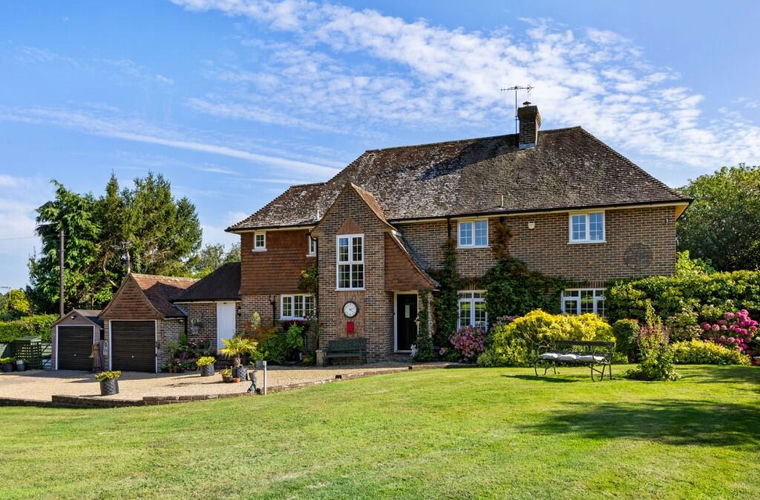 Accessed via a private driveway that begins on the Lewes Road, the entrance to this large, detached house is both impressive and secluded/ The electric timber gates open onto a generous, sweeping gravel driveway, offering ample parking and leading you to the property. To the right, a beautifully maintained lawned front garden creates an inviting first impression, enhancing the home's curb appeal. The drive gracefully approaches the house and its adjoining garaging, ensuring both privacy and convenience in a tranquil, rural setting.