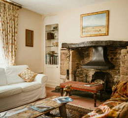 To the left are two well-proportioned reception rooms connected with double doors, each with warming inglenook fireplaces displaying bare rubble stone and rustic oak lintels. Shuttered windows on the south and west walls chart the sunlight through the day.