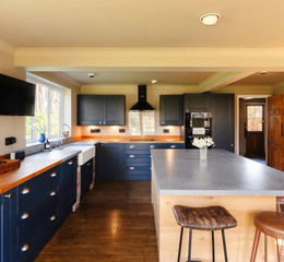 The kitchen/breakfast room is particularly impressive - broad, light-filled and anchored by a large central island. Painted cabinetry and timber worktops lend a relaxed, contemporary country feel, while glazed doors open directly onto the terrace, creating an easy connection between inside and out. There is also a separate utility room adding practicality suited to family living.