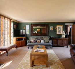 The Property - The house is arranged across two floors, with a natural flow from a central entrance hall into the principal living spaces. The sitting room is calm and inviting, with a wood-burning stove set against soft green tones and wide windows overlooking the garden.