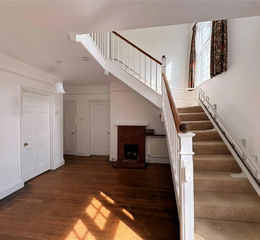 An impressive and vast entrance hall/reception with original features to include picture rail, deep torus skirting boards and solid oak flooring, stairs rising to first floor landing with wooden spindle balustrades and contrasting oak hand rail and with a leaded window on the part landing to side aspect. An original fireplace with brick hearth and backing with inset cast fire sits to one wall. Thermostat control panel, alarm control panel, smoke alarm, window to side aspect, white panel doors give access to ground floor accommodation