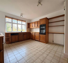 Fitted with a range of oak fronted eye and drawer line base level units with solid wooden work surfaces over and tiling above. Inset one and a half bowl single drainer sink unit with mixer tap over, integrated dishwasher and fridge, integrated eye level electric oven with integrated electric hob and extractor fan over to opposite wall. To the back wall are further drawer line base level units with feature glass fronted display shelving over, tiled flooring, window to rear aspect, white panel door to utility and :-