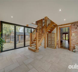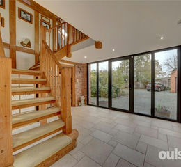 Step into elegance with this stunning property, where floor-to-ceiling crittal-style doors invite you into a light-filled entrance hallway, showcasing an impressive wooden turning staircase and bi-fold doors that open onto a private patio area.