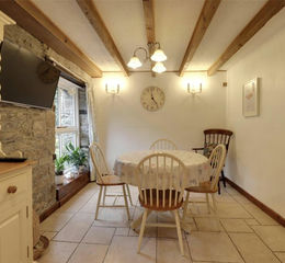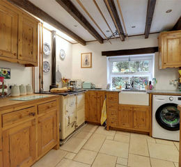 The accommodation is entered via a stable door into a welcoming entrance hall with a study area. The inviting lounge enjoys a dual aspect, with double doors opening onto the patio and an additional stable door to the side. A wood burning stove creates a warm and atmospheric focal point. The spacious kitchen and dining room is fitted with traditional units complemented by granite worktops, free standing furniture and a Belfast style sink. An oil fired Aga is also in place. A delightful sun room, added in recent years, overlooks the rear garden and provides a peaceful space in which to relax. A shower room with WC completes the ground floor.