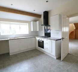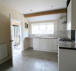 DINING/KITCHEN (4.25m x 2.85m) including fitted base and wall cabinets with contrasting worktops, integral single oven and 4 ring gas hob with extractor fan over, 1 ½ bowl sink, space for washer, radiator and rear garden outlook.
