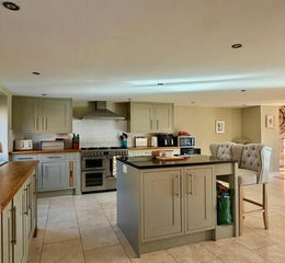 Kitchen/Dining Room - A modern fitted kitchen comprising matching wall and base units with solid wood work surface space over, 1 1/2 bowl sink and drainer unit, fitted island with granite work surface, integrated dishwasher, belling range cooker with seven ring gas hob with electric ovens below (available at separate negotiation), space for a freestanding fridge/freezer, ample space for dining and/or living, double glazed window and door to the rear, door into the utility and two large openings into the