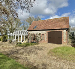 Adjacent the main house, a substantial and attractive brick and flint barn can be found. Built around 1990, the barn is in good condition, vaulted and extending to 30' in length, with stairs leading up to a mezzanine level, offering exciting potential for its use. A large conservatory adjoins the barn and provides a great place to relax and enjoy superb views across the garden. A double garage/workshop allows for further parking or a work/hobby space, with power and light, along with two sets of double doors.