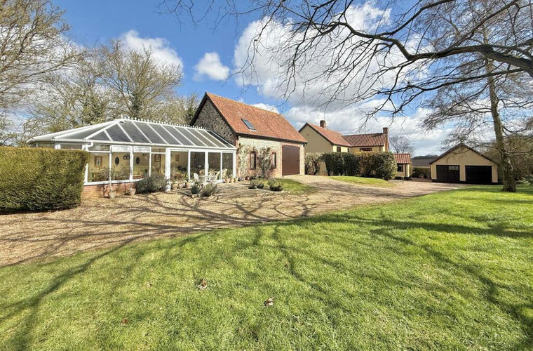 Attractive 4 bedroom detached residence. Rural countryside setting. Mature grounds extending to 1.28 ac. Far reaching views. Double garage/workshop. Unconverted brick and flint barn with mezzanine level and impressive adjoining conservatory. No chain.